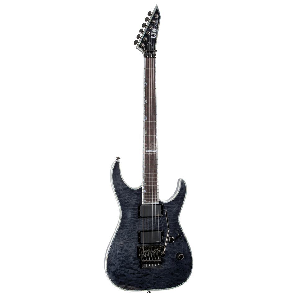 The ESP Guitar MH-1000 w/EMGs Electric Guitar See Thru Black is rocking with quilted maple top, a set-neck, powerful active EMG pickups and a Floyd Rose tremolo.