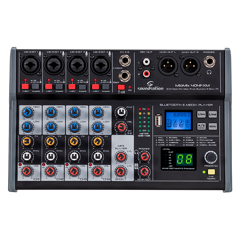 MioMix 404FXM is a 6-channel mixer with USB player and digital multi-effect ideal for small home recording, live gigs and podcasting applications that require professional quality level and maximum portability. 4 Mic inputs are equipped with noise-less preamps that accepts all main sound sources, such as condenser microphones – thanks to the +48V Phantom Power, dynamic mics, line and high-impedance inputs (guitars, basses, etc.). The stereo line input allow you to connect keyboards, CD players, DJ consoles, tablets, smartphones, etc. The USB & BT player accepts WAV, MP3, WMA and FLAC format audio files, as well as wireless audio streaming (BT). It also records your gig in MP3 format (48kHz/16bit @ 128Kbps). The 24-bit/48kHz digital effect with 16 commonly used presets (Hall/Room/Plate Reverb, Delay, Echo, Chorus, etc.) and TAP-Tempo function let you improve your performance and adjust up to two parameters of each effect. An indispensable and reliable tool for all small audio applications.